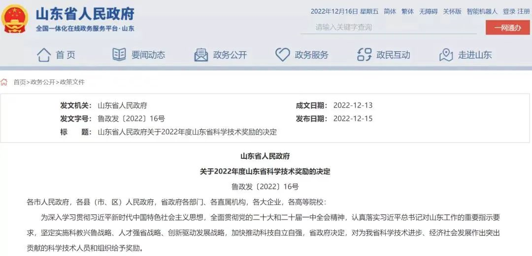 12月15日,山东省人民政府发布了《关于2022年度山东省科学技术奖励的决定》,51视频