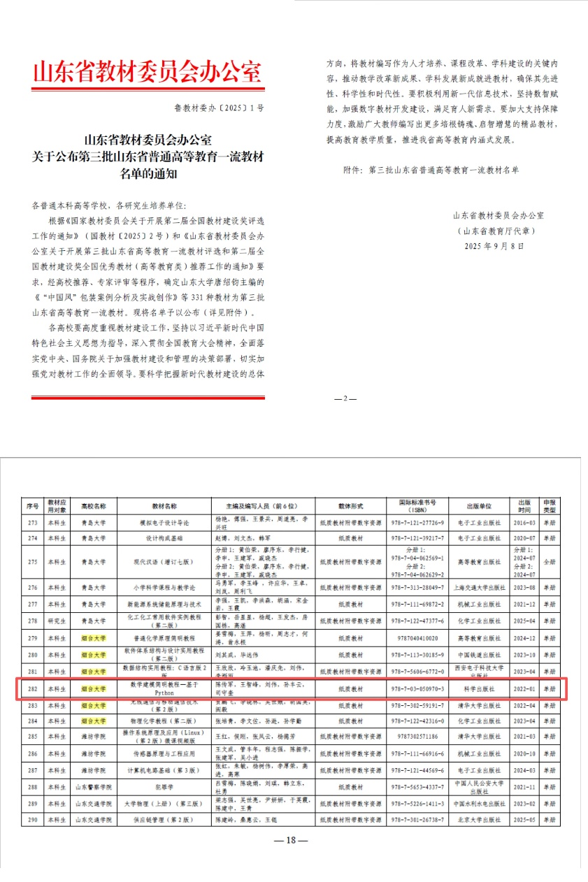 陈传军教授主编的《数学建模简明教程—基于Python》成功入选选第三批山东省普通高等教育一流教材。