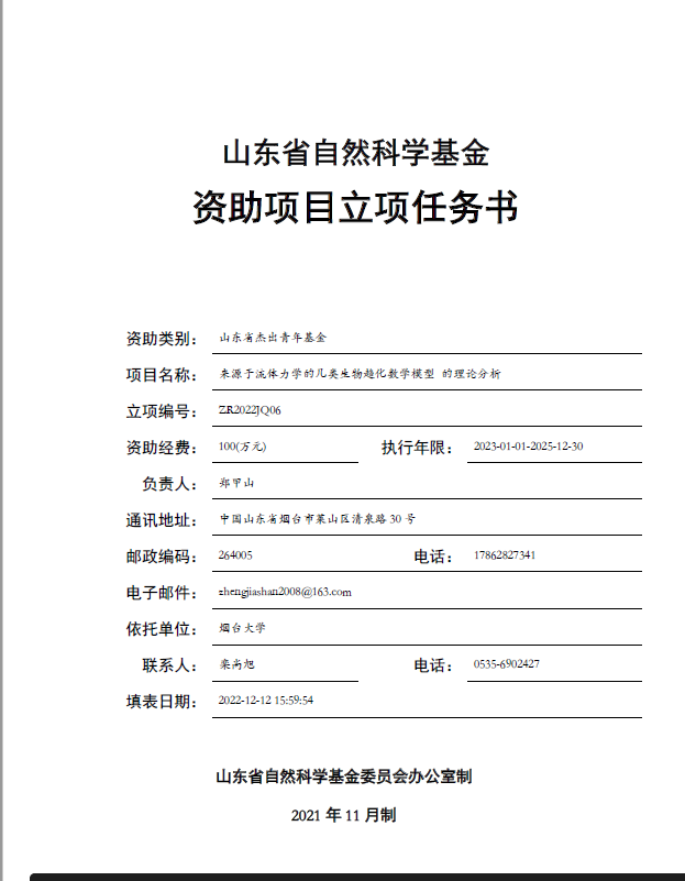 郑甲山老师一直致力于生物趋化模型的研究,主持完成山东省优秀青年基金、国家自然科学基金、中国博士后科学基金面上项目和特别资助等省部级以上科研项目5项,在国内外高水平期刊发表SCI论文50余篇。
