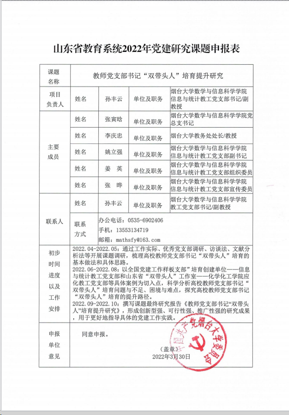 信息与统计教工党支部书记孙丰云主持,研究团队由党建工作人员和年轻博士组成。课题组坚持问题导向,联系教育工作实际,拟探索研究党建引领地方高校高质量发展的方法路径。通过工作实际、优秀党支部调研、访谈、文献分析法等开展课题调研,将课题研究作为破解重点难点问题、切实提升党建质量的重要举措来抓,争取提出切合工作实际、针对性和操作性强的思路措施,努力形成创新性强、可行性强、推广性强的研究成果。