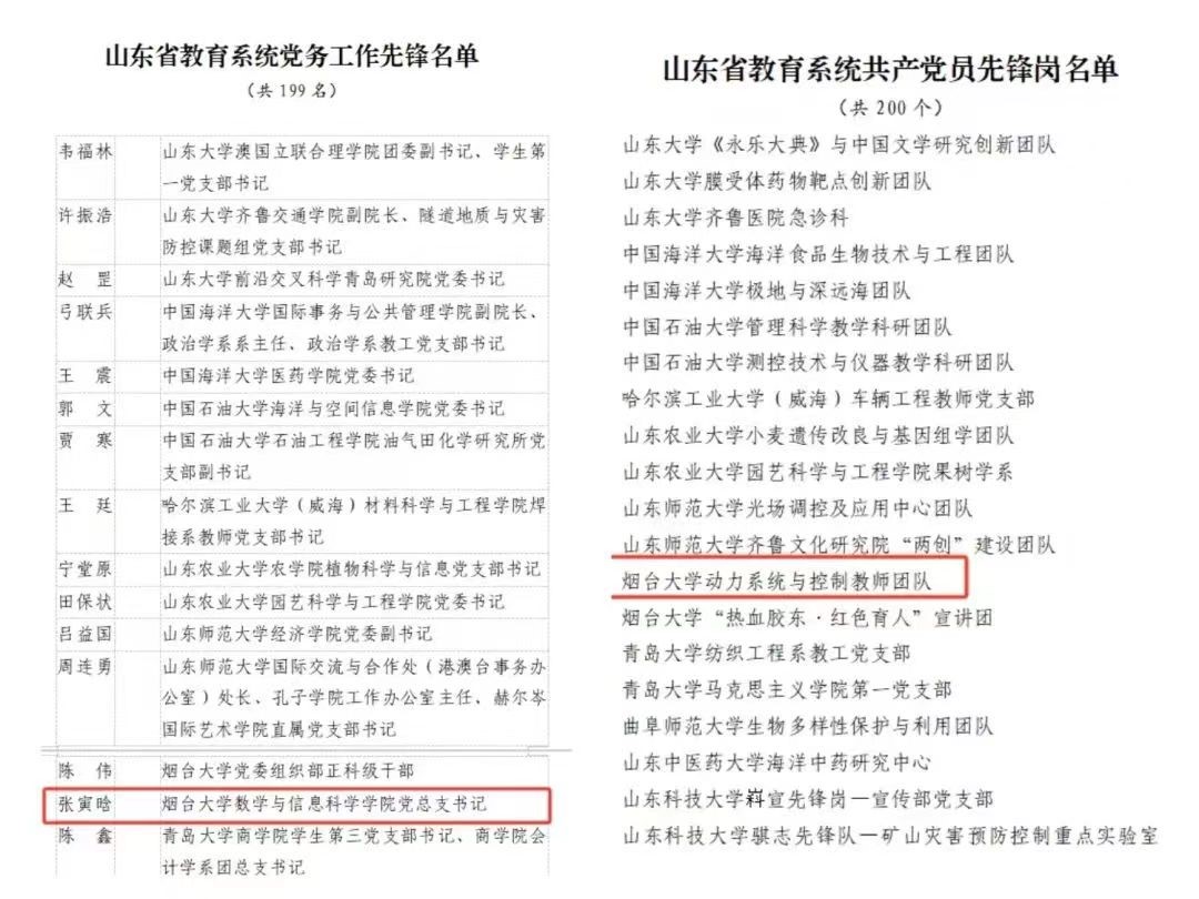 信息与统计教工党支部动力系统与控制教师团队获评“山东省教育系统共产党员先锋岗”称号,党总支书记张寅晗获评“山东省教育系统党务工作先锋”称号。